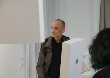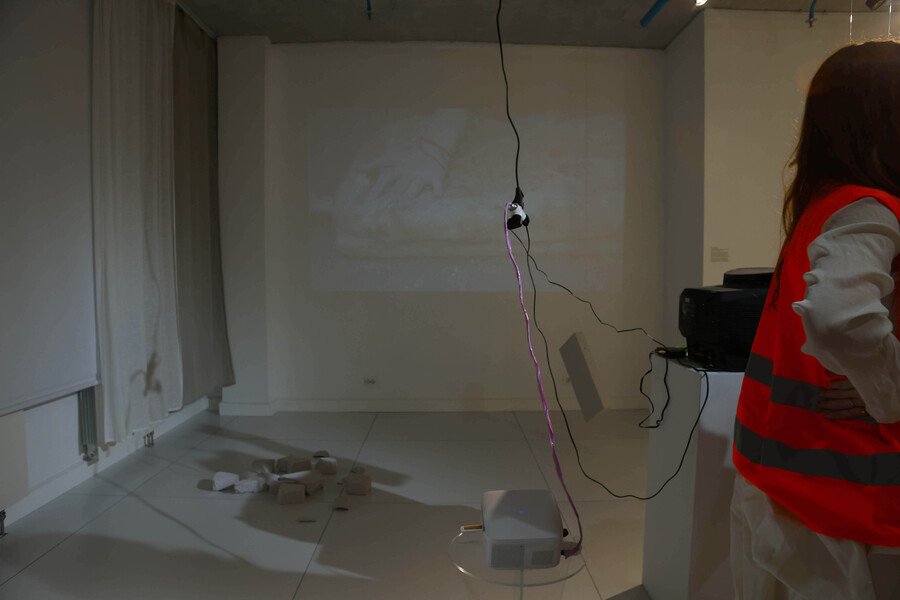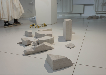 Материал отсылает к незавершенной стройке, которая в моей интерпретации выступает символом самого процесса жизни — неизбежно меняющейся, но не способной достичь своей окончательной материальной формы. Блоки закреплены в «балансирующем» положении, делая акцент на чувстве тревоги за будущее, которое невозможно игнорировать, но и нельзя преодолеть. Инсталляцию сопровождают хаотично воспроизводимые звуки падения и разбивания кирпичей.