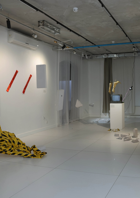 В пространстве галереи подвешены пеноблоки в динамичных положениях, имитирующих их падение, визуализируя состояние перманентной тревоги и страха. Какие-то из них уже разбились, демонстрируя реальность переживаний. За основу для инсталляции был взят образ летящего откуда-то сверху кирпича как страха перед внезапными жизненными обстоятельствами, заставляющими принимать решение и действовать прямо сейчас. Невозможность контролировать независящие от субъекта события рождает постоянное ожидание катастрофы, удара судьбы, которого может и не наступить. Следовательно, человек, живущий в этом страхе, сам метафорически начинает отождествляться с инсталляцией из пеноблоков, находясь в состоянии неопределенности, позиции «между». И любой выход за пределы собственных рамок будет ощущаться как свободное падение.