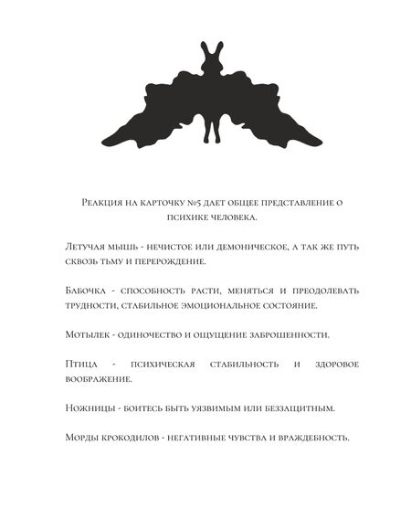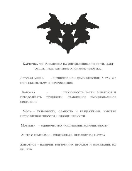В данной методике стимульный материал представляет собой карточки с симметричными чернильными пятнами, созданные в технике монотипии. В данном случае украшения, так же как и карточки из теста, становятся стимулом для воображения, игрой ассоциаций со зрителем, которые могут позволить раскрыть глубинные тенденции личности как дизайнера, так и самого обладателя данных изделий.
