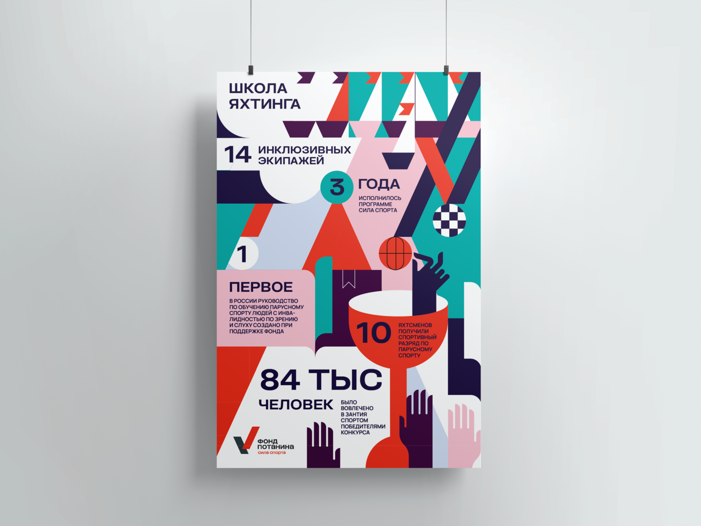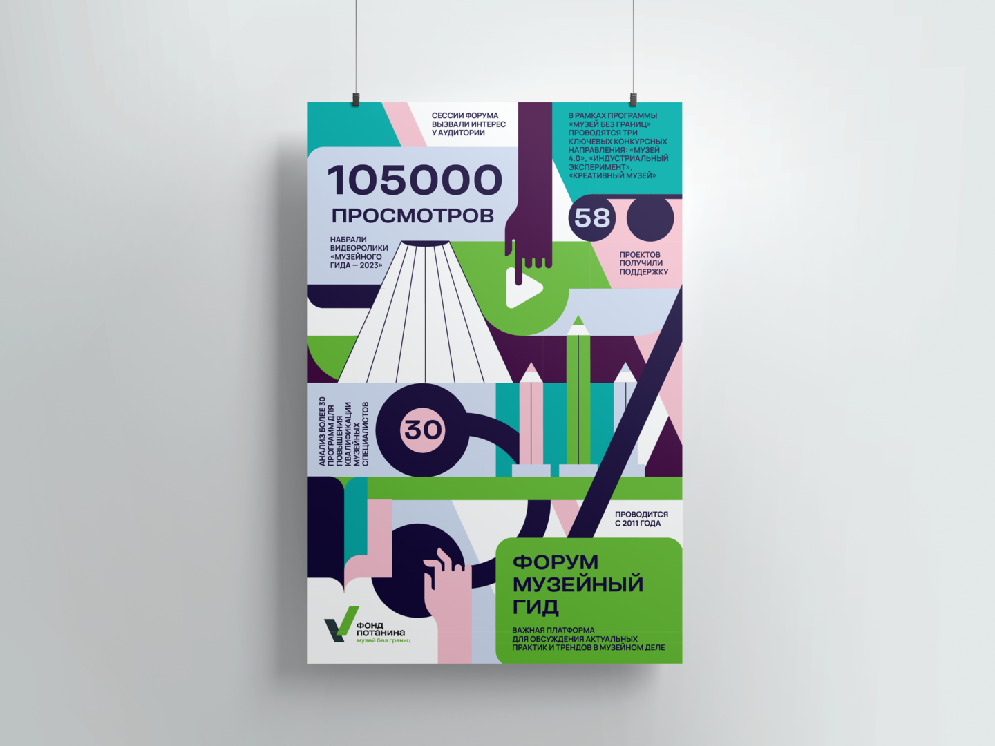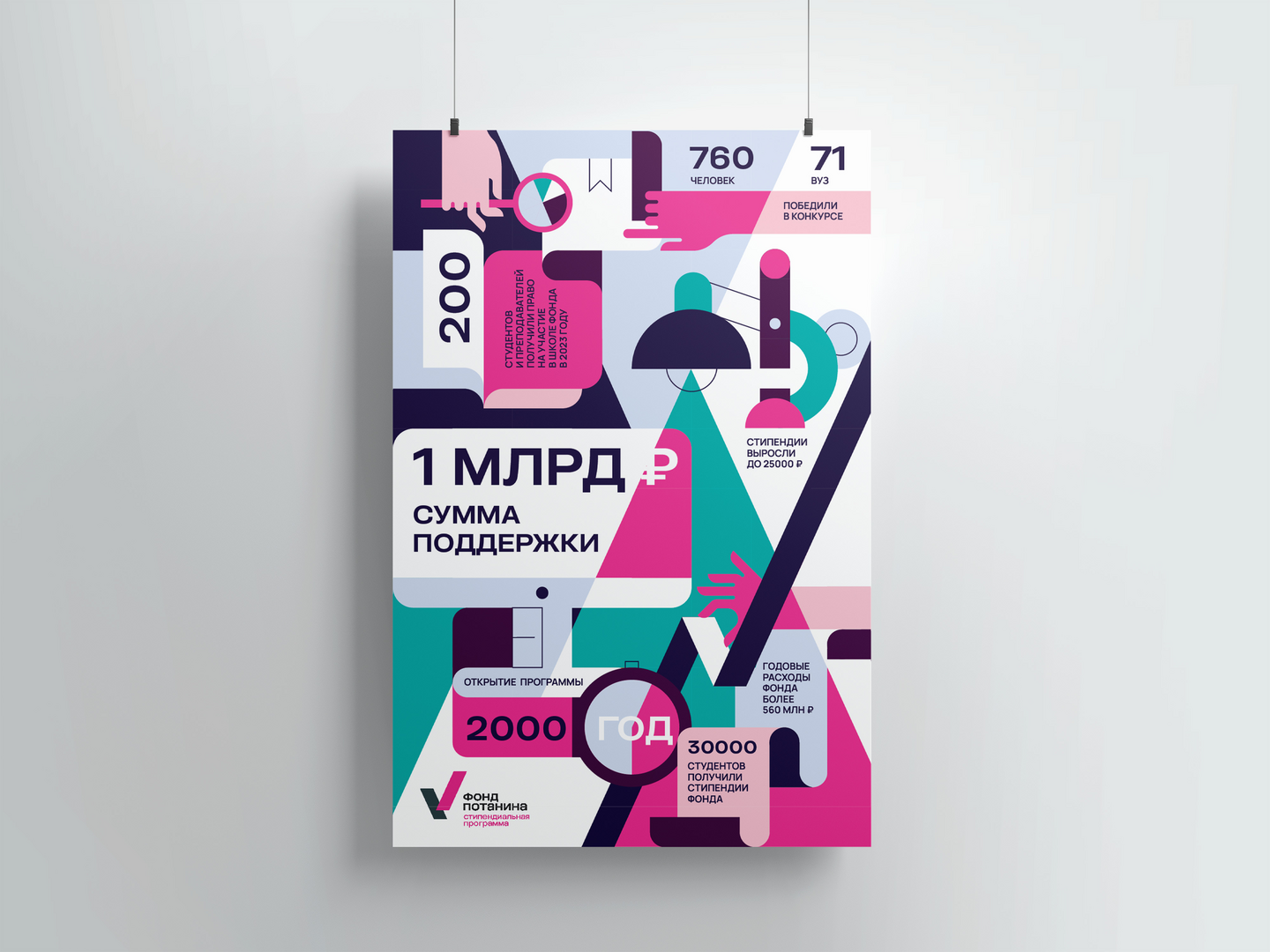 For a series of posters on the achievements of the Potanine Foundation over the past year, an additional color palette has been developed that harmoniously complements the existing brand colours. The new palette is designed to make the visual style more intelligent and culturally representative of the Fund ' s values. Posters have been carried out in the infographic genre, thus providing a clear and accessible picture of the Fund ' s achievements to both long-standing partners and potential target audiences.