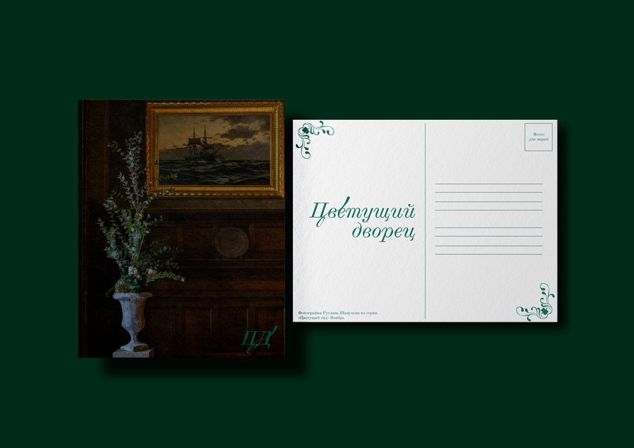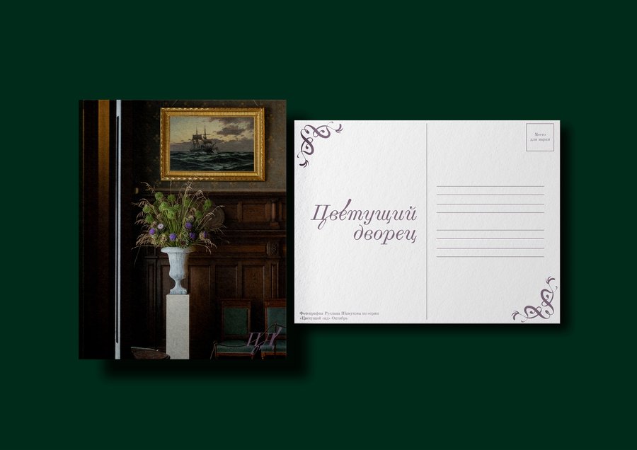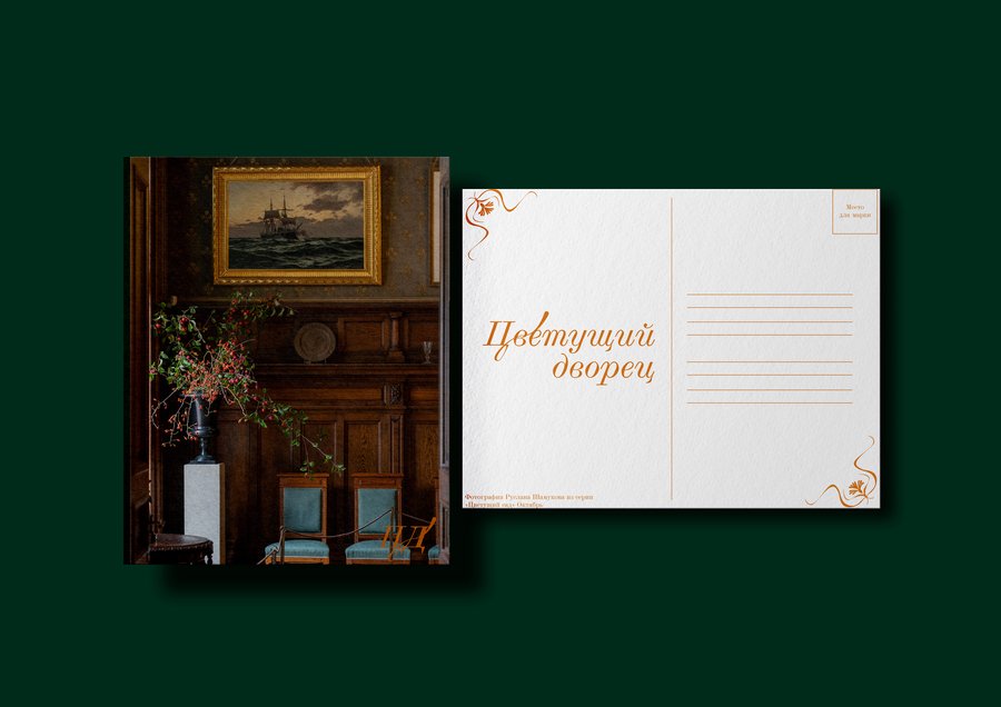 Основой для метафоры стал тот факт, что цветочные композиции лишь дополняют основную экспозицию музея, а не становятся центральными героями. Поэтому и графика встраивается внутрь сувениров, выступая в качестве условной рамки.