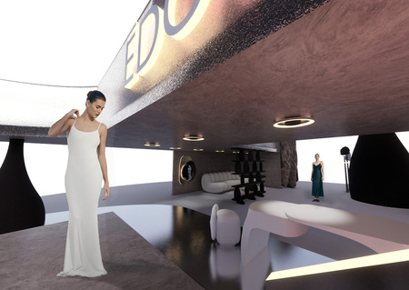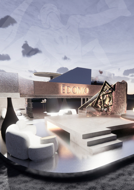 В основе стенда лежат множество платформ на разных уровнях, которые повторяют очертания предметов мебели бренда. На заднем плане стенда расположена композиция, состоящая из 3 воссозданных столов EDOMO (DOMES и BEANS) увеличенных в размере. В одном, из них интегрирована фотобудка для памятных фотографий в шапке папахе.