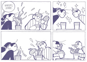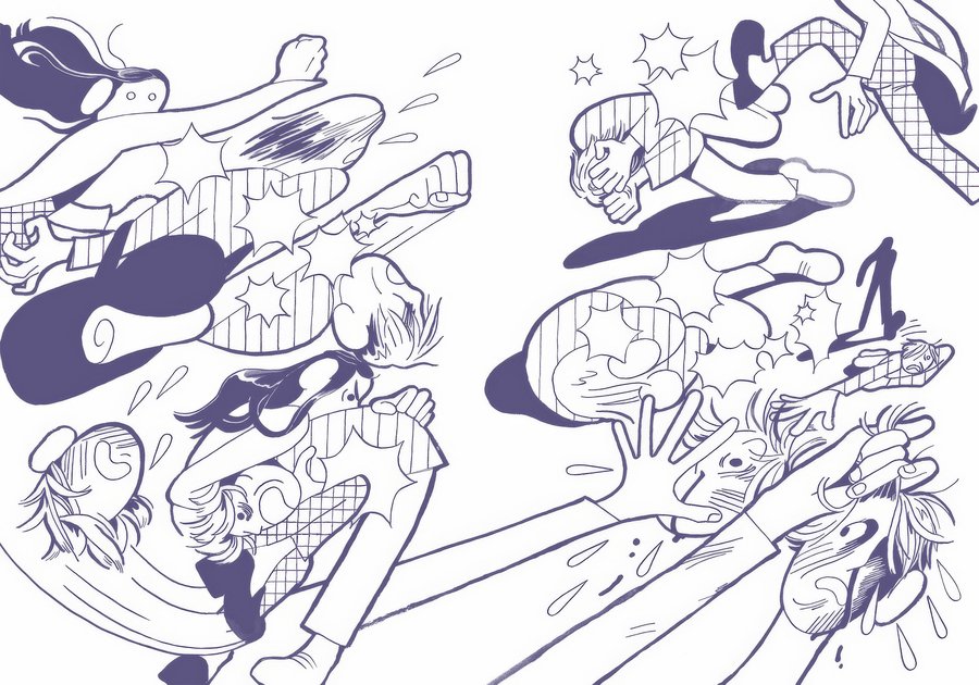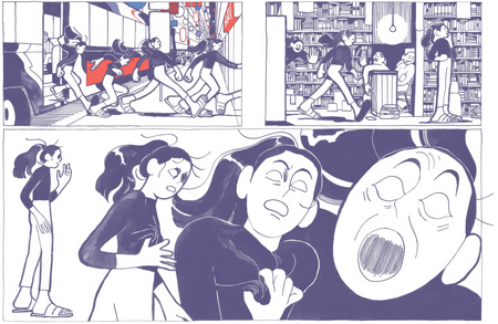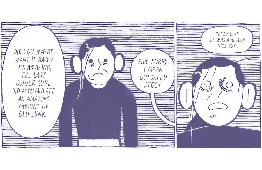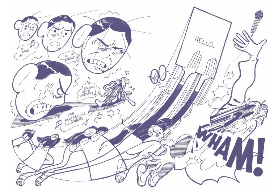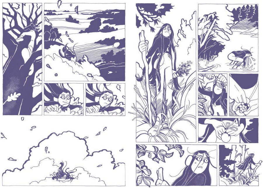 Так Леа Мюравьек свободно деформирует предметную канву: нередко объекты и персонажи в руках комиксистки становятся мягкими и податливыми, как воск. Автор ритмически двигает, пропорционально искажает обыденное, сообщая ему черты абсурдистского.