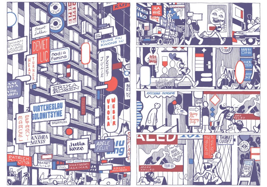 На четырех разворотах графического романа Леа Мюравьек переносит читателя в свой аналог знакомства с Мегаполисом — восемь страниц без диалогов, абсолютно безмолвные и беззвучные, демонстрирующие всю разрушительную красоту города: повсюду, куда бы ни взглянул читатель, мелькают имена, многочисленные билборды, вывески, уникальные, неповторимые, единственные в своем роде. Во всем этом — глянцевый блеск казино, не фотореализм, а его умелое искажение, абсурдистский максимализм в деталях, медленное перенасыщение пышностью и помпезностью происходящего. Мегаполис в «Великой Пустоте», каким бы неровным и извилистым он ни был, не упускает ни единой мелочи в демонстрации своей сути. Городской пейзаж не столько прорисован, сколько намеренно перегружен: он удушливый, неизбежный, лишающий читателя представления о какой-либо точке схода.