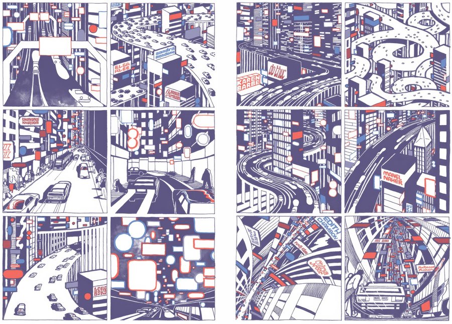 Неслучайно Мегаполис — это единственное цветное пространство в комиксе. Все остальное — жизнь, протекающая внутри «человейников» и за чертой города, в «Великой Пустоте», — залито однородным, блеклым, темно-фиолетовым оттенком. Город постепенно высасывает все краски из своих жителей, питается повсеместно циркулирующим «вниманием», пускает украденные у людей живительные силы по своим венам — запутанным магистралям, извивающимся, ведущим в никуда дорогам.