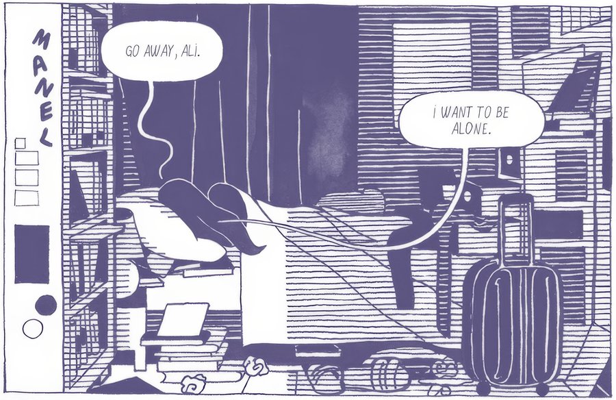 Этот приём можно увидеть и в других эпизодах, например, в сцене ссоры Али и Манел. Однако здесь Леа Мюравьек не использует фреймы и оставляет страницу пустой. Такой приём работает как монтажная склейка, позволяющая читателю на мгновение остановиться и осмыслить один из самых неоднозначных моментов в сюжете.