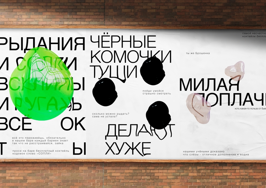 Проект рос итерационно. Чтобы глубже раскрыть эмоциональную составляющую бренда, я создала серию плакатов. В них я использовала экспрессивную типографику и смелые образы. Потекшие буквы, написанные тушью, и даже акцидентный шрифт, вырезанный из обычной картошки, — все это помогало говорить честно и без прикрас.