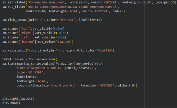 В проекте я использовала четыре типа графиков, каждый из которых решал свою задачу. Линейный график с его плавной кривой показал 85-летний тренд, позволив увидеть три большие волны популярности Marvel — 1960-е, 1990-е и 2010-е. Чтобы выделить из этой кривой самые значимые точки, я построила горизонтальную столбчатую диаграмму, которая сравнила топ-10 рекордных лет и сделала очевидным лидерство 1993 года. Затем вертикальная столбчатая диаграмма помогла сместить фокус с времени на контент, показав, какие конкретные серии комиксов оказались самыми живучими и формируют костяк вселенной. Кольцевая диаграмма с группировкой по десятилетиям дала понять масштаб изменений, показав, что больше 60% контента Marvel было создано уже после 1990 года. Такой набор визуализаций позволил рассмотреть историю издательства и издалека, и в деталях ключевых моментов.