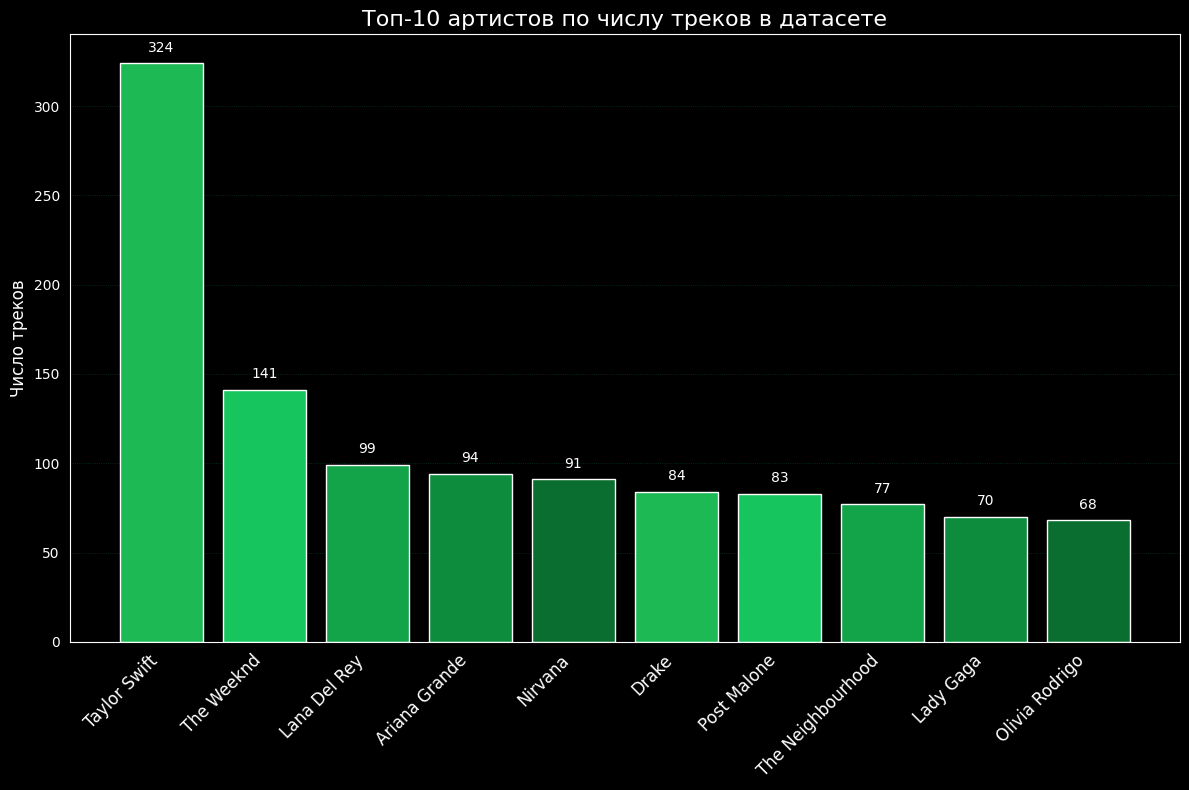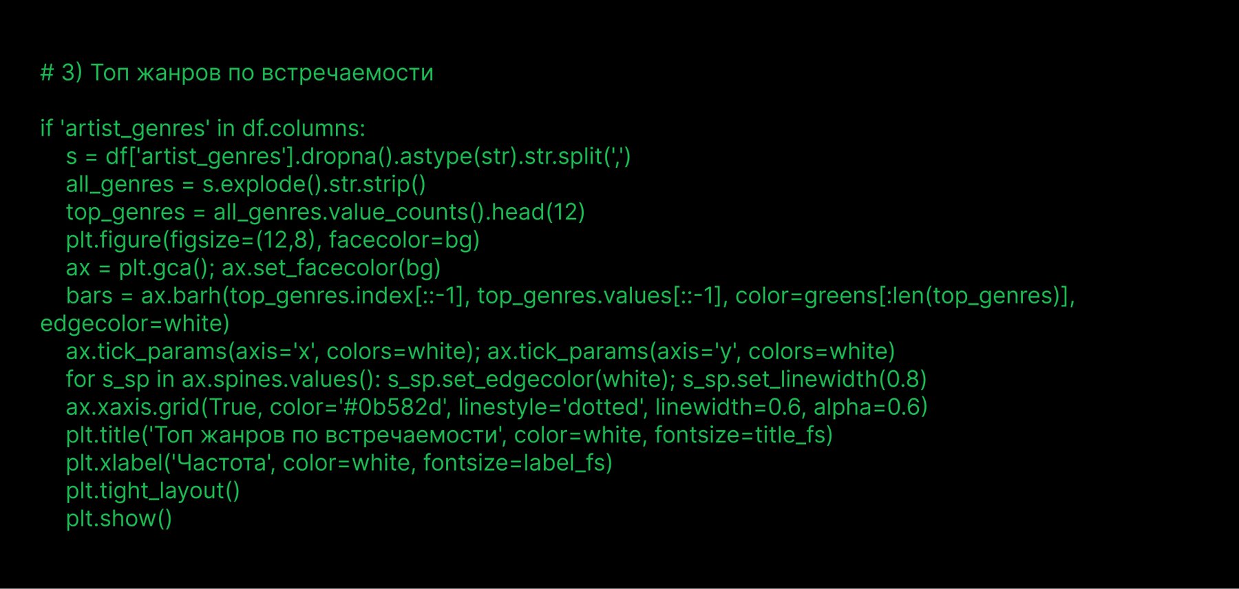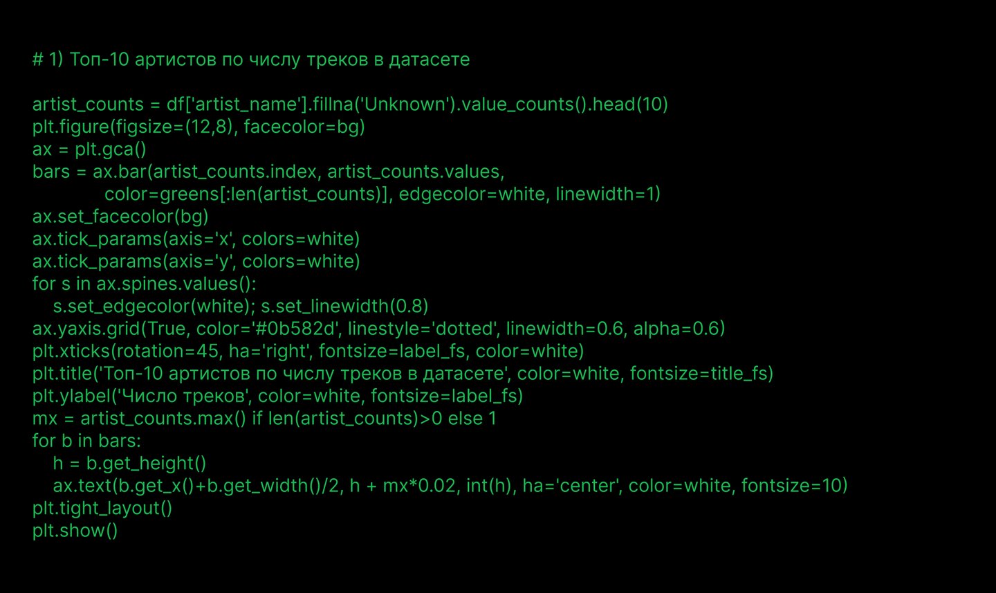 - чёрный (#000000) — фон графиков, - зелёный Spotify (#1DB954) — основной акцентный цвет, - белый (#FFFFFF) — текст, подписи, сетка, - и набор зелёных оттенков для многоцветных диаграм