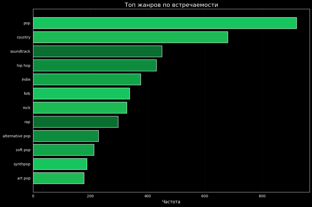 Горизонтальная столбчатая диаграмма: топ жанров по встречаемости