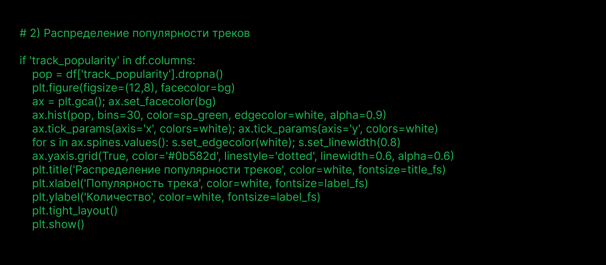 1. Датасет был загружен в формате CSV и преобразован для удобства работы. 2. Были очищены и подготовлены данные: — числовые колонки (track_popularity, artist_popularity, artist_followers) приведены к числовому формату; — дата релиза альбома парсилась в корректный формат, из неё извлекался год; — пропущенные значения обработаны консервативно для сохранения целостности данных. 3. Для визуализации использовались библиотеки Matplotlib, Seaborn и NumPy.