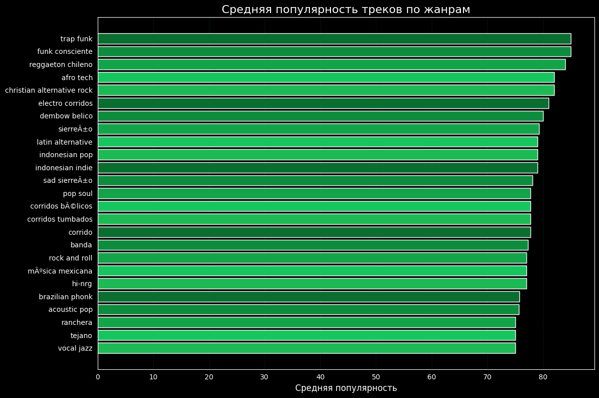 Горизонтальная столбчатая диаграмма: средняя популярность треков по жанрам