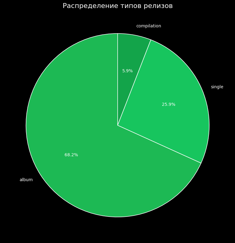 Диаграмма показывает соотношение различных форматов релизов (альбомы, синглы, сборники и др.). В общем — очень доминируют выпуски песен по альбомам