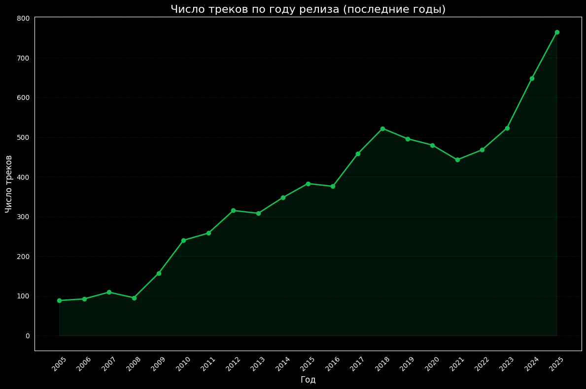 Линейная диаграмма: число треков по году релиза (последние годы)