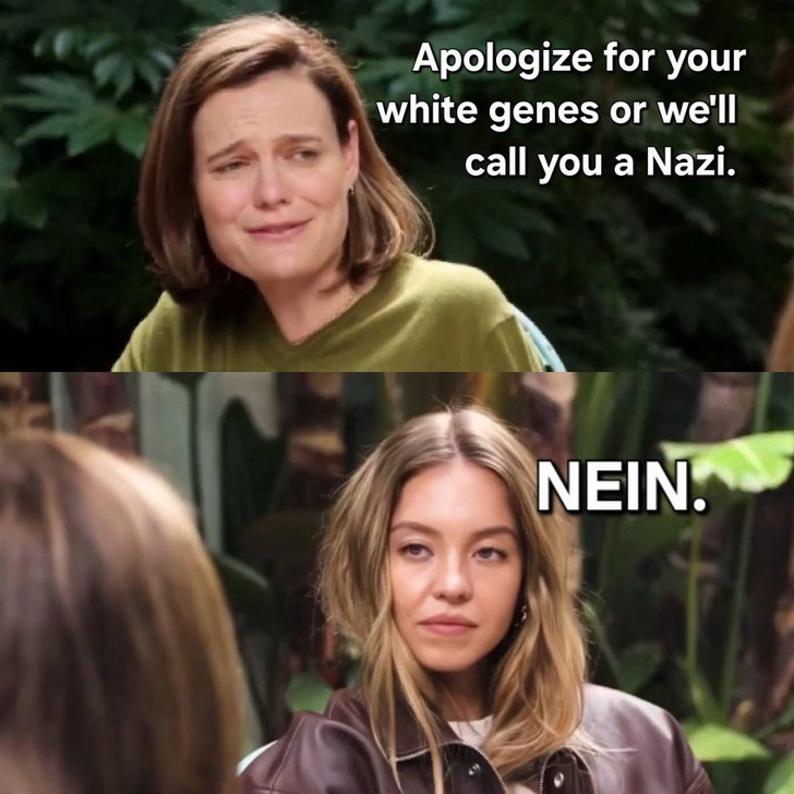 Самые вирусные форматы — сравнения позы Сидни из интервью GQ (ноябрь 2025), где она сидит скрестив руки и молчит перед вопросом про расизм, с кадром Эдварда Нортона из фильма «Американская история X» (тот же жест, но в нацистском контексте). Другие популярные мемы: Гитлер в тех же джинсах AE, протестующие против «евгеники» на билборде и Трамп с подписью «Great jeans, huge… sales».
