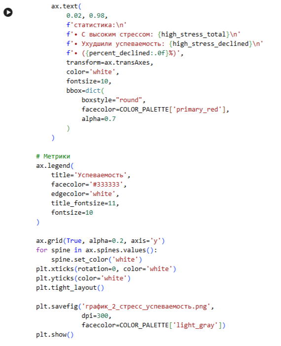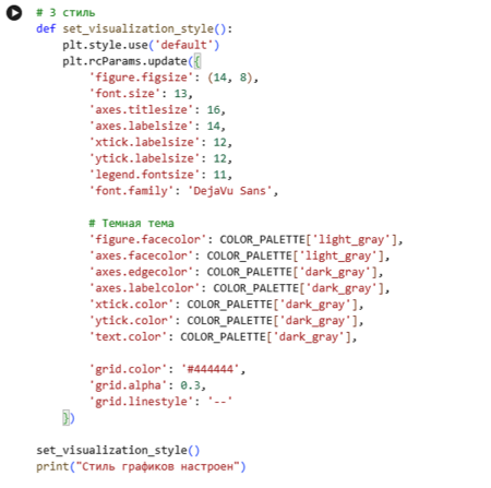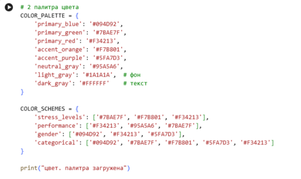 Для стилизации графиков прежде всего я сгенерировала единую цветовую палитру с помощью сайта coolors.co. Она стала точкой вдохновения, и уже с помощью готовых цветов я создала инфографики в едином стиле через настройку rcParams. Во всех графиках присутствует темный фон, белый текст и набор семантических цветов.
