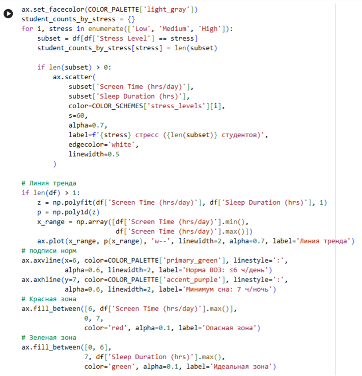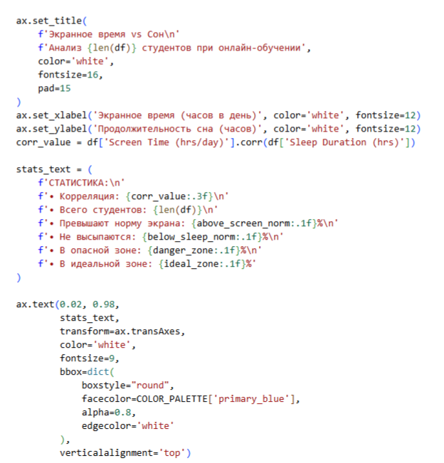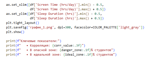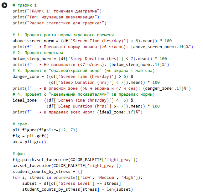 ГРАФИК 1: точечная диаграмма Тип: Изучающая визуализация Расчет статистики для графика: • Превышают норму экрана (>6 ч/день): 57,9% • Не высыпаются (<7 ч/ночь): 59,9% • В опасной зоне (>6 ч э