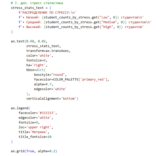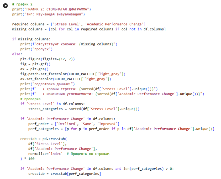 Второй график — это столбчатая диаграмма. С его помощью можно пронаблюдать, как уровень стресса влияет на академическую успеваемость студентов.