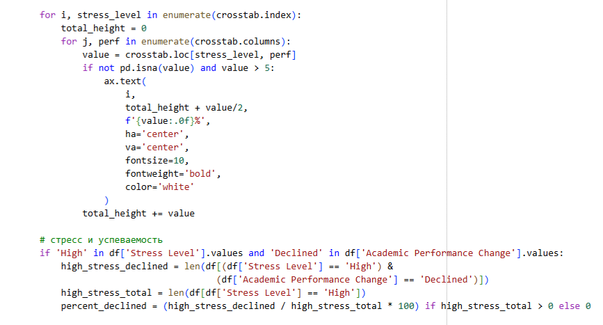 Обращаясь к данным графика, видно, сто с ростом стресса (слева направо), красная часть столбца увеличивается. Это показывает, что чем выше стресс, тем ниже успеваемость студентов.
