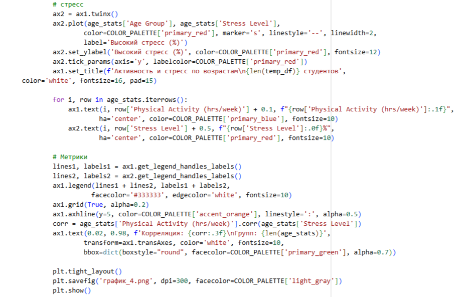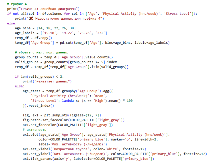 Четвертый и последний график — линейная диаграмма. Он отображает изменения физической активности и стресса у студентов разных возрастов и зависимость друг представленных метрик друг от друга.