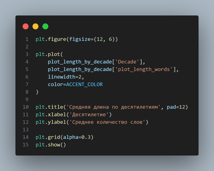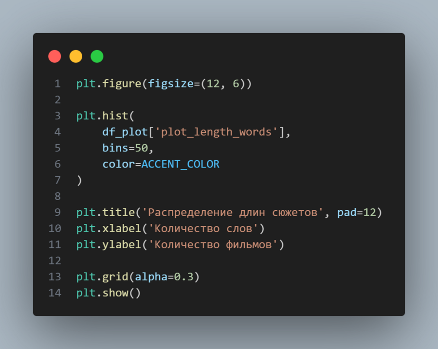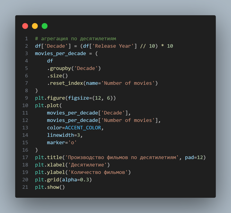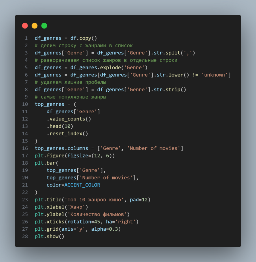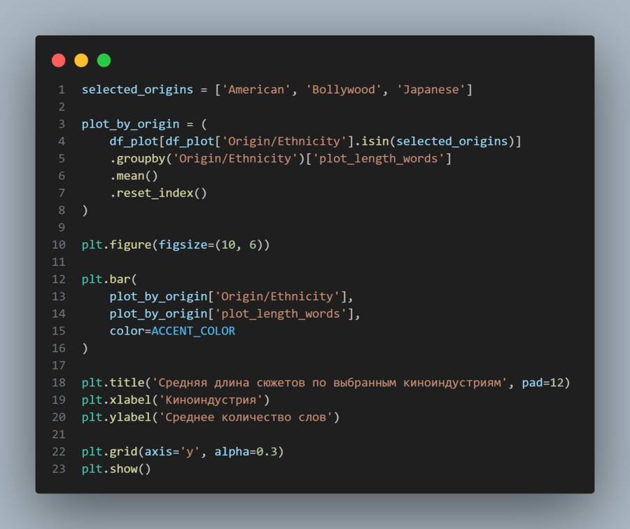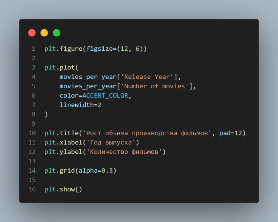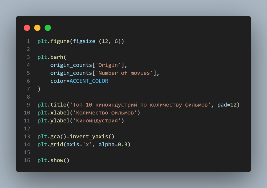 Для визуализации данных был разработан единый визуальный стиль. В качестве основы был выбран тёмный фон, ассоциирующийся с кинозалом, а красный цвет использовался как акцентный, отсылающий к эстетике киноафиш и фестивалей. Все параметры визуализации были прописаны в коде с помощью Matplotlib, что обеспечило консистентность графиков.