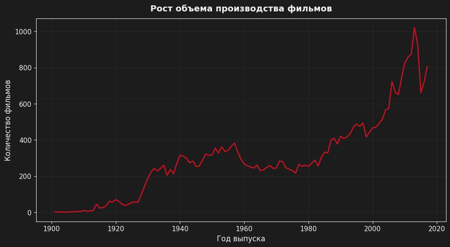 Линейный график отражает изменение количества выпущенных фильмов по годам с 1901 по 2017 год. Наблюдается устойчивый рост производства, особенно заметный во второй половине XX века и в начале XXI века. Отдельные периоды спада могут быть связаны с историческими и технологическими факторами, а также особенностями представления данных в источнике.