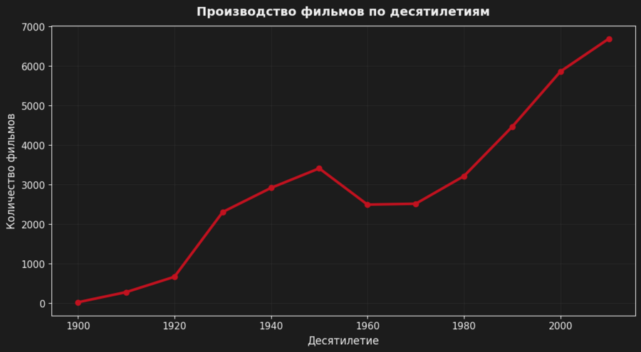 Агрегация данных по десятилетиям позволяет сгладить годовые колебания и наглядно показать долгосрочные тренды. Заметен выраженный спад в период 1960–1970-х годов, когда количество выпускаемых фильмов временно сокращается. Начиная с конца 1970–1980-х годов, производство вновь выходит на траекторию устойчивого роста, достигая максимальных значений в 2010-е годы.