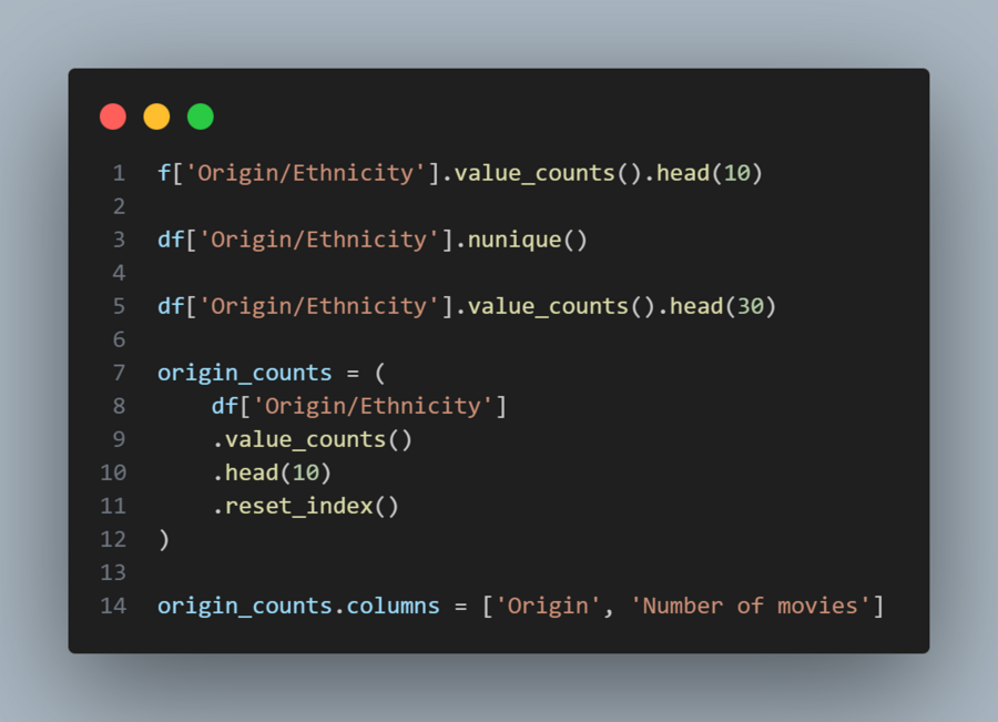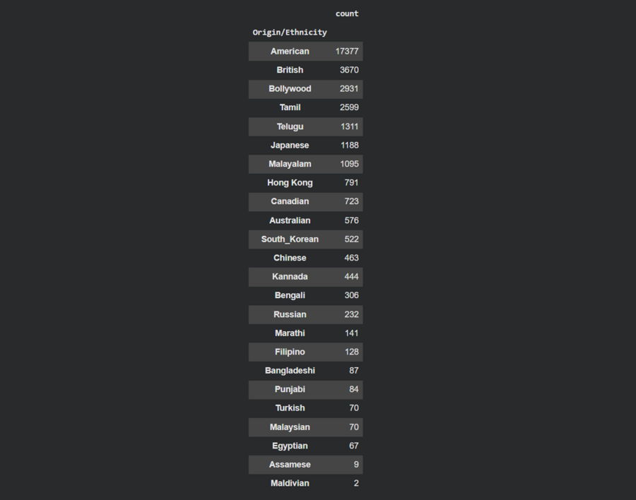 Следующим этапом мне интересно было изучить где производят больше фильмов. Эта информация представлена в колонке Origin/Ethnicity, анализ которой показал, что в датасете представлены не только страны, но и отдельные региональные киноиндустрии. Особенно детально представлено индийское кино, где каждая языковая и культурная группа рассматривается как отдельная категория. Это отражает специфику источника данных и подчёркивает неравномерность представления мирового кино в Википедии.