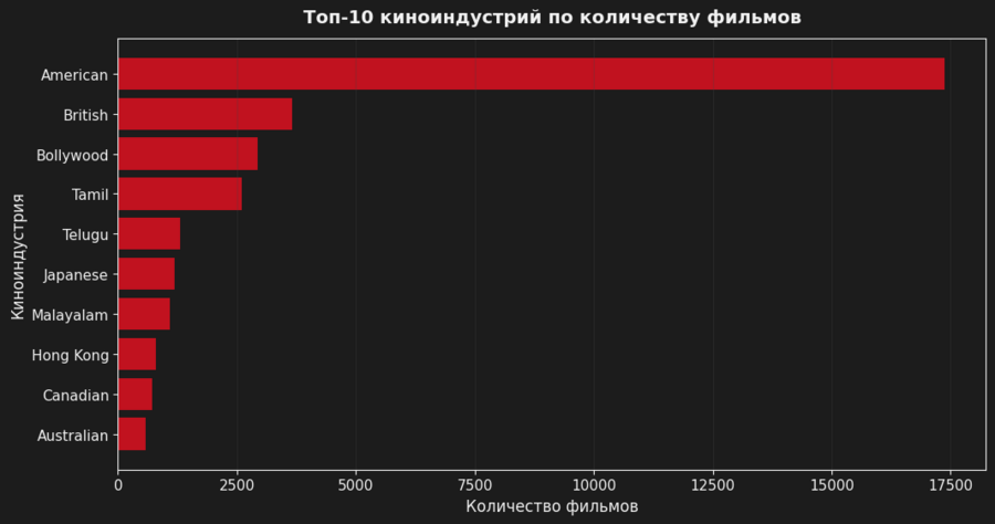 Столбчатая диаграмма показывает распределение фильмов по крупнейшим киноиндустриям, представленным в датасете. Лидирующую позицию занимает американская киноиндустрия, значительно опережающая остальные по количеству фильмов. На втором месте находится британская киноиндустрия. Важно отметить высокую представленность региональных индийских индустрий — Bollywood, Tamil и Telugu, что подчёркивает масштаб и разнообразие кинопроизводства за пределами западного кино. Также в топ входят японская, гонконгская, канадская и австралийская киноиндустрии.