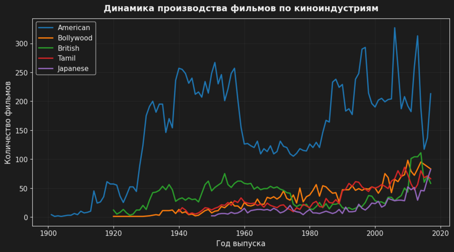 Линейный график показывает изменение объёма производства фильмов во времени для пяти крупнейших киноиндустрий. Американская киноиндустрия стабильно лидирует на протяжении всего рассматриваемого периода, демонстрируя резкий рост в первой половине XX века, спад в середине века и повторный подъём начиная с 1980-х годов. Примечательно, что развиваться эта индустрия начала на два десятилетия раньше остальных. Индийские киноиндустрии (Bollywood и Tamil) демонстрируют устойчивый рост, особенно заметный с конца XX века, что отражает расширение регионального кинопроизводства. Британская и японская киноиндустрии развиваются более умеренно, с постепенным увеличением объёмов производства и меньшими колебаниями по сравнению с американской.