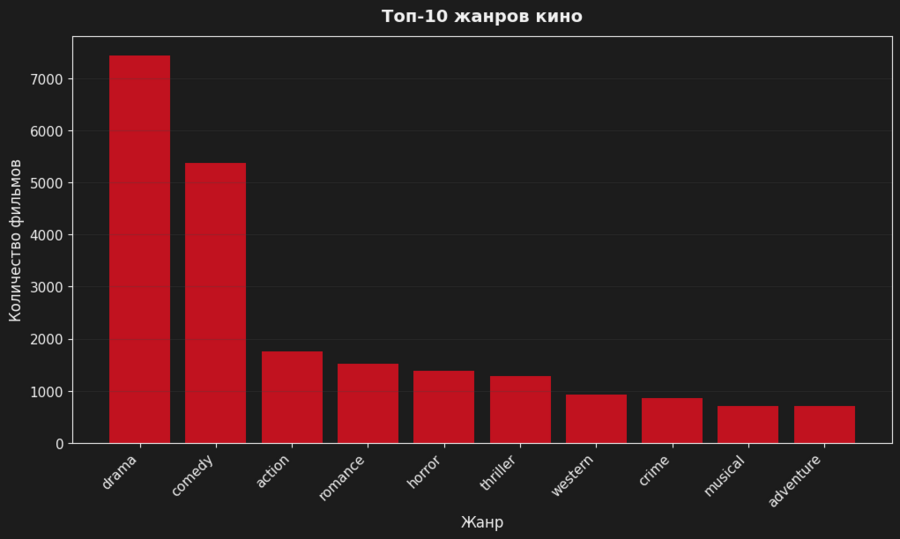 Драма и комедия являются наиболее распространёнными жанрами, значительно опережая остальные. При этом после третьего места наблюдается относительно равномерное распределение жанров, что отражает разнообразие тем и форм в кино.