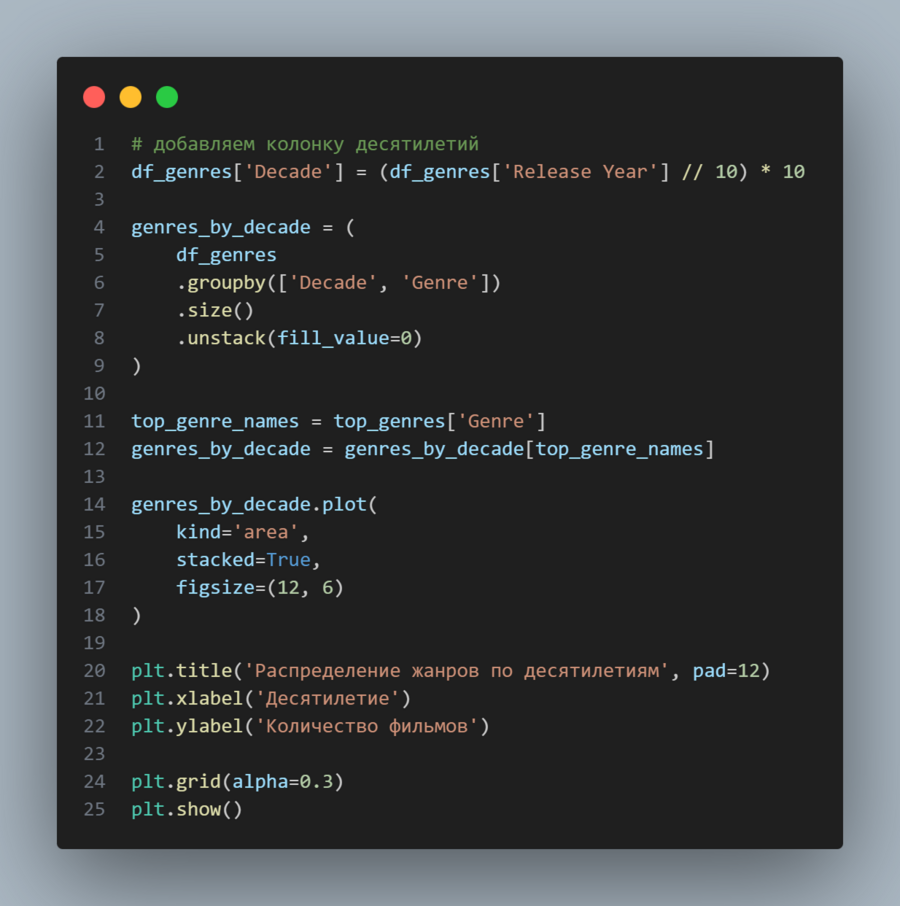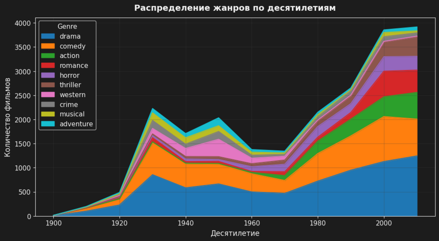 Жанровый анализ показал, что драма и комедия являются наиболее универсальными и массовыми жанрами, существенно опережая остальные. Распределение жанров по десятилетиям выявило снижение разнообразия в середине XX века и его последующее расширение, что может отражать изменения в общественных запросах и производственных возможностях киноиндустрии.