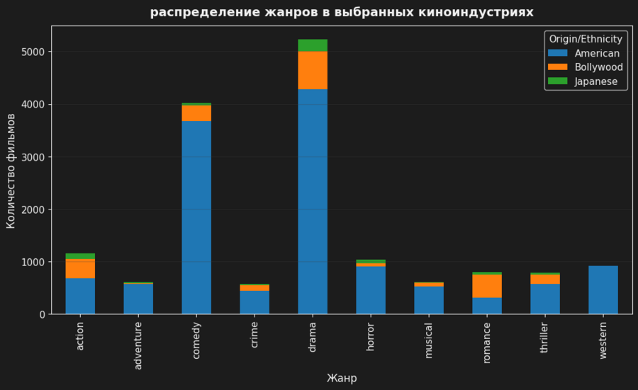 Интересно было посмотреть не только на репрезентацию жанров в кино в целом, но и на их распределение в отдельных киноиндустриях. Для сравнения я выбрала американскую, индийскую и японскую киноиндустрии.
