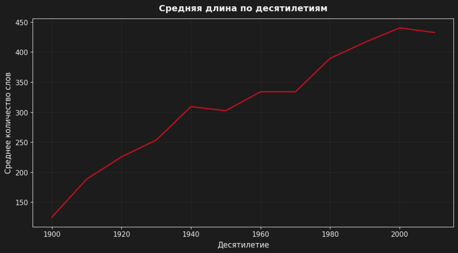 На графике видно, что средняя длина сюжетных описаний постепенно увеличивается, что может свидетельствовать о росте сложности повествования или о более подробном документировании фильмов в современных источниках.