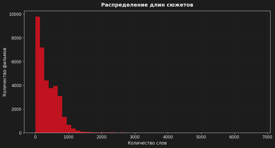 Чтобы посмотреть на равномерность описаний я сделала распределение по количеству слов и фильмов. Распределение имеет длинный хвост, что указывает на наличие фильмов с крайне подробными сюжетными описаниями.