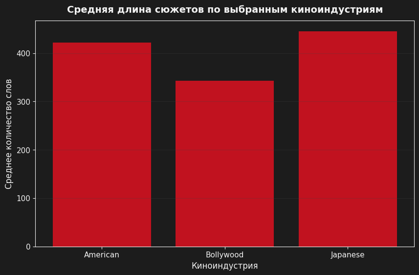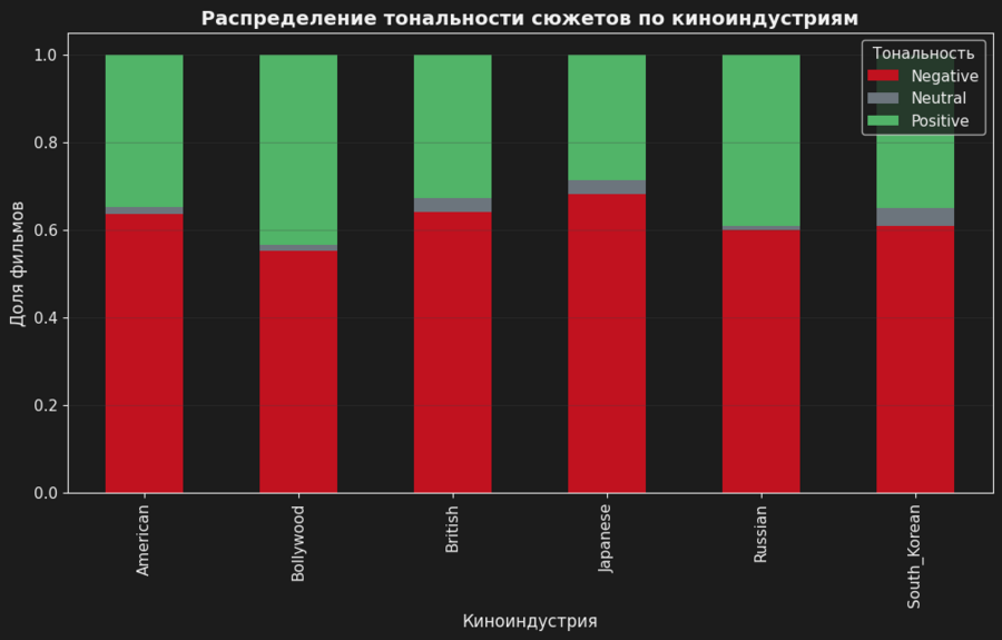 Анализ сюжетов с помощью методов автоматического анализа тональности (VADER) продемонстрировал различия в эмоциональной окраске фильмов разных киноиндустрий. В частности, сюжеты Bollywood в среднем оказались более позитивными, тогда как фильмы японской киноиндустрии чаще содержат негативную тональность. Это подчёркивает культурные различия в повествовательных традициях и тематике кино.