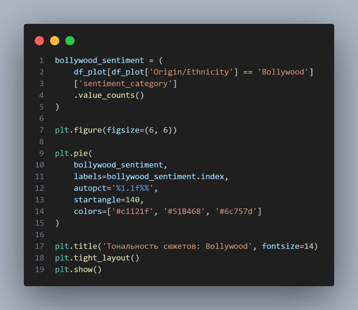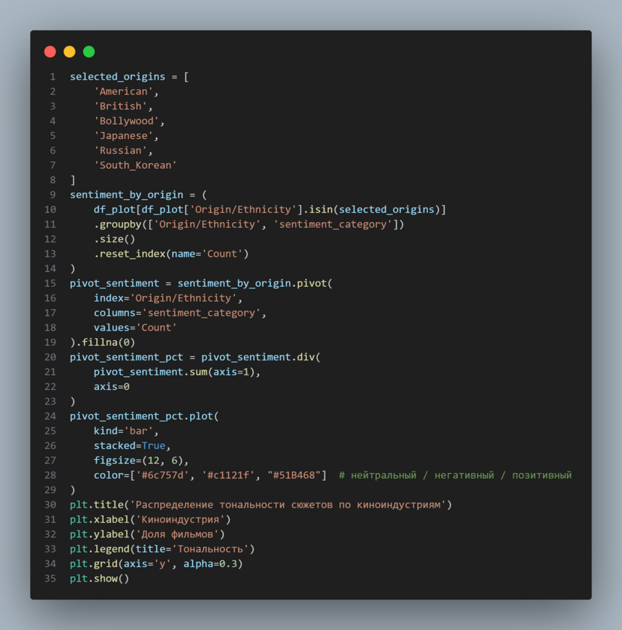 Для анализа эмоциональной окраски сюжетов использовался лексиконный sentiment-анализ (VADER). Метод основан на подсчёте позитивных и негативных слов в тексте и позволяет сравнивать тональность сюжетных описаний между киноиндустриями.