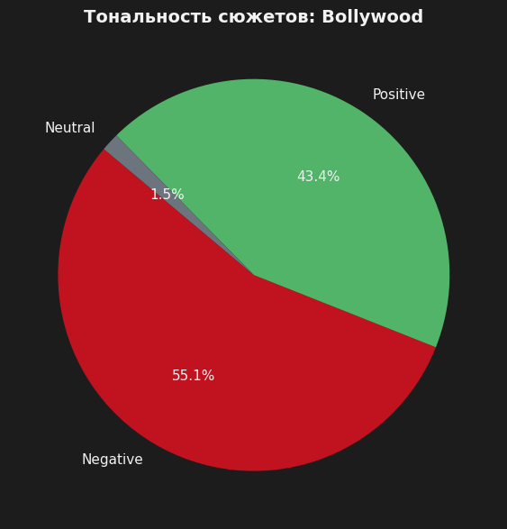 Почти половина фильмов киноиндустрии Bollywood имеют позитивную эмоциональную окраску, что соответствует жанровой специфике индустрии, ориентированной на эмоционально воодушевляющие и оптимистичные истории.