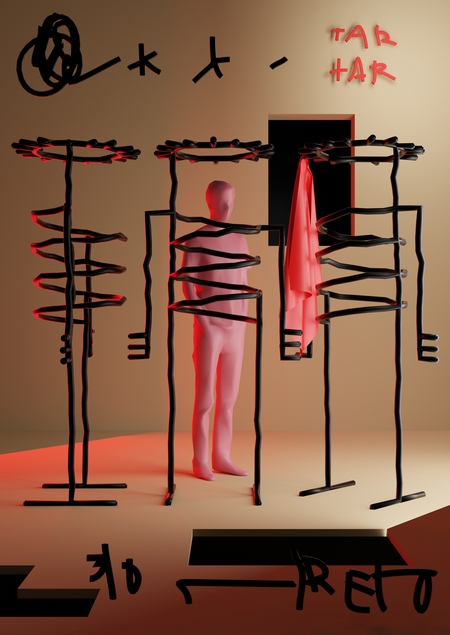 Выбранные материалы и техники производства ещё одна отсылка к Баския. Металлические конструкции — кости, кожа — плоть.