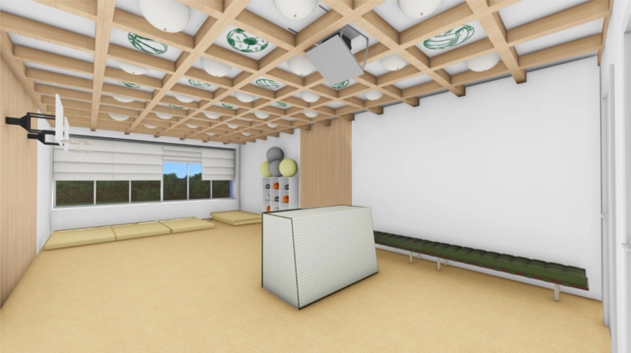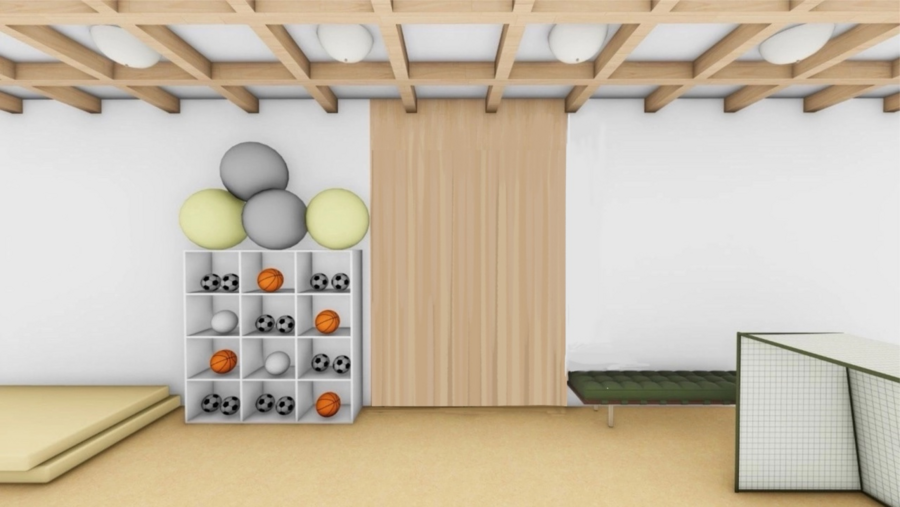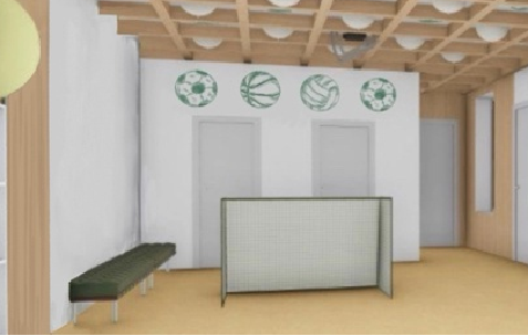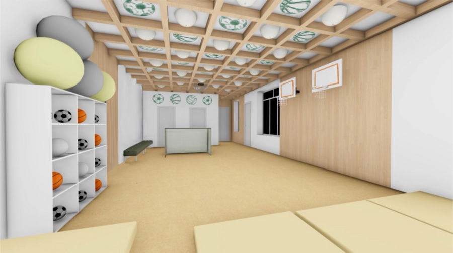 Проект спортивного зала для учеников с ОВЗ создан в светлой палитре с акцентом на безопасность и комфорт. Напольное покрытие — рулонное ПВХ покрытие с амортизирующим слоем тёплого жёлтого оттенка (травм безопасность, гигиеничность). Деревянные панели из МДФ и потолок грильято под дерево с графичным рисунком мечей создают уют. Основной цвет — тёплый молочный. Зал разделен на зоны: гимнастика, интерактивная стена и пол (мультимедийное пространство от проектора), стеллаж с мягкими развивающими фигурами, гимнастические мячи жёлтого и зелёного цветов, лавочка для отдыха. Пастельные природные тона подобраны для спокойствия и комфорта особенных детей.