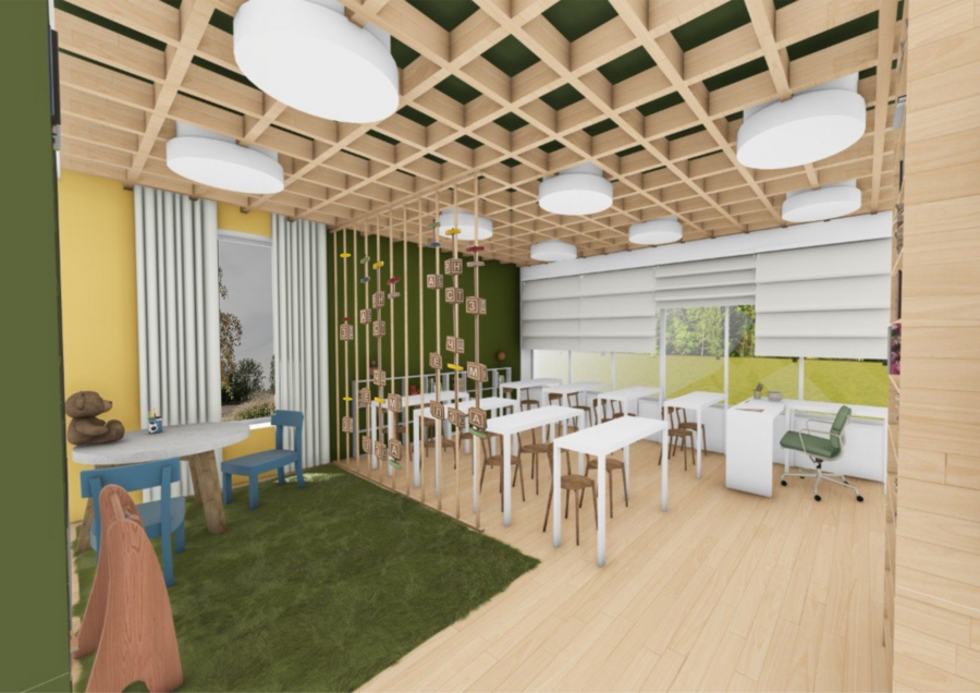 Особое внимание уделено эргономике и безопасности: регулируемые парты и стулья с поддержкой осанки, столы с вырезами для колясок, мягкие ортопедические модули в зоне отдыха, мебель без острых углов, с гипоаллергенной обивкой.