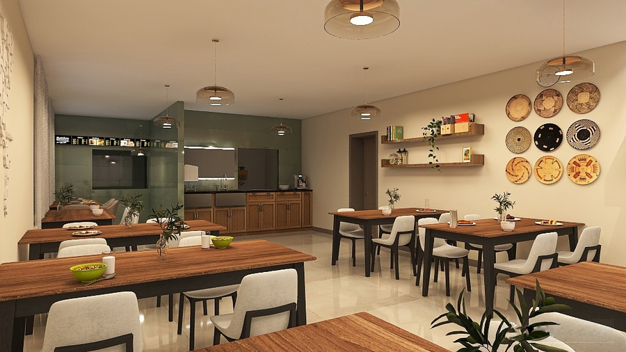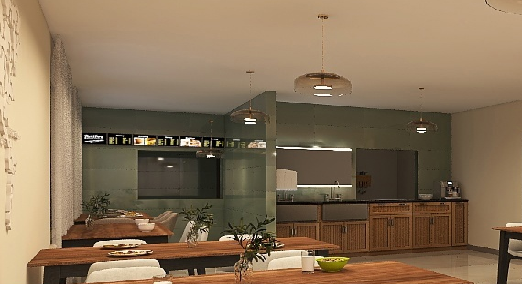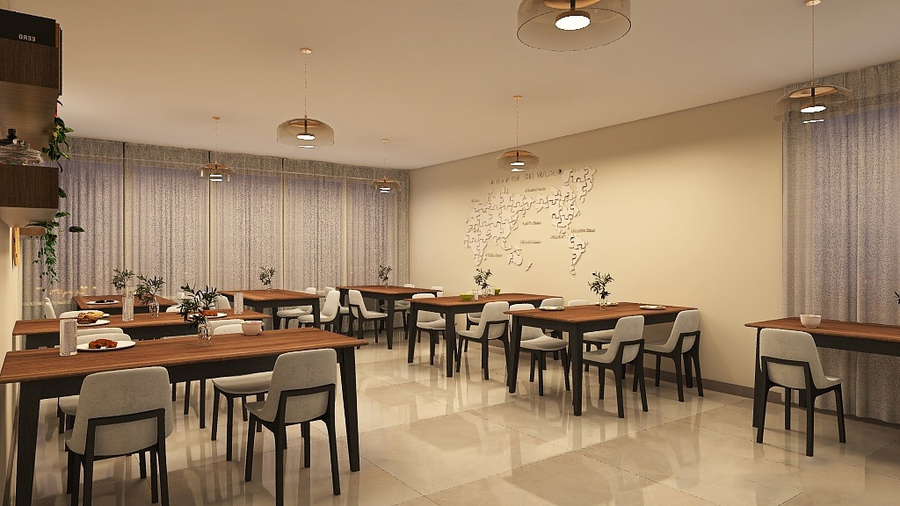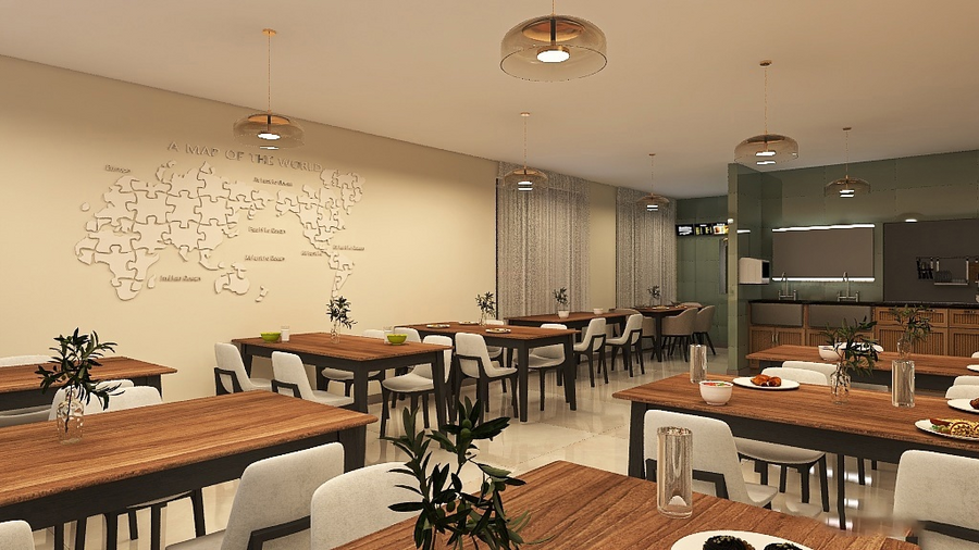 Проект школьной столовой для учеников с ОВЗ создан в природных тонах: тёплый молочный (основной) и акцентный лесной зелёный (успокаивающий эффект). Мебель выполнена из натурального дерева (экологичность, тактильность). Пространство способствует комфортному приему пищи и эмоциональной разгрузке. Используются приемы зонирования, учитывающие особенности детей.
