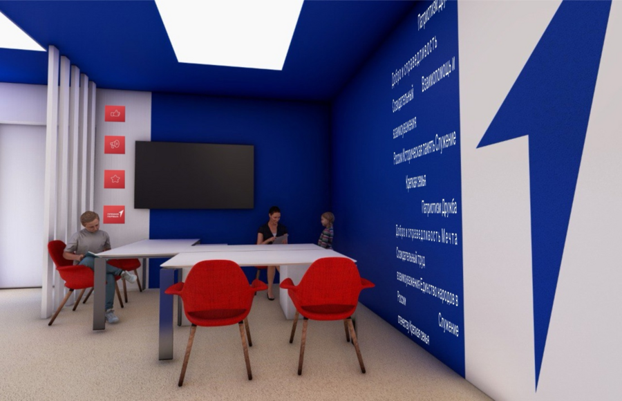 Проект холла «Движение первых» в школе для учеников с ОВЗ выполнен в фирменных цветах: темно-синий (основа), красный (акцент) и белый. Помещение зонировано: