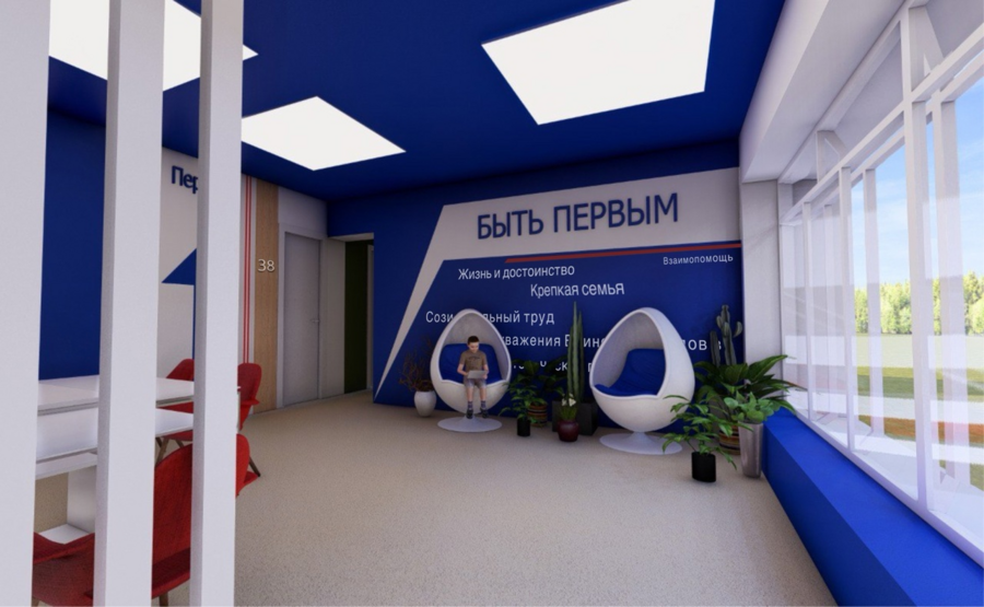 • Рабочая зона: стол для учителя, 2 парты, телевизор с символикой «Движение первых». • Зона отдыха: ботанический сад, подоконник-"мягкое окно», два кресла-яйца (комфортное уединение для детей с аутизмом).