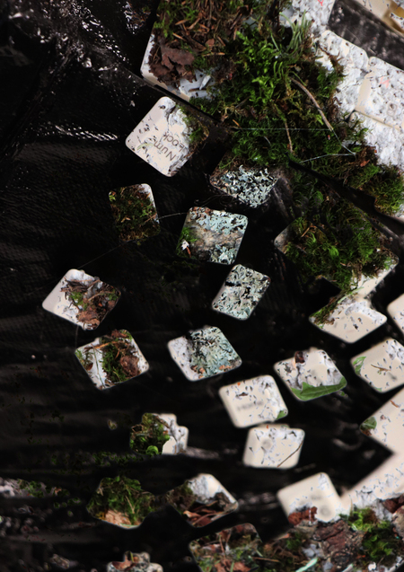 Арт-объект сделан в виде плаща, который укрывает человека от враждебной действительности. Внешняя сторона — метафора цифровизации и ухода в мир технологий. Внутренняя сторона — попытка человека уйти от реальности через природу.