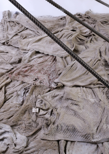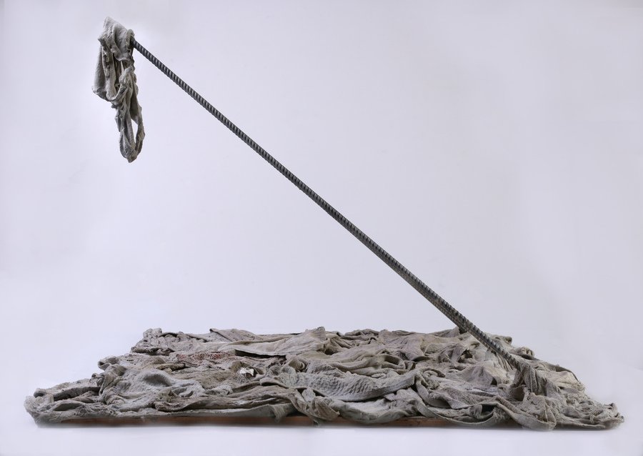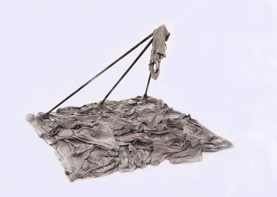 В скульптуре я проблематизирую этот момент шаткого положение внутри социального контекста с помощью элементов нижнего белья и актуализирую вопрос личного пространства. Фетишизированный объект, символ эротики и женской сексуальности, объективизированный только за счёт своей принадлежности, сопоставляется с брутальными неестественными материалами — бетоном и арматурой. Тем самым демонстрируется слияние некого техногенно-жестокого с личным. Также в вопросе о форме скульптуры я ссылаюсь на «Клятву Горациев» Жак Луи Давида. Прутья арматуры представляют собой трезубец, направленный ввысь, как бы стремящийся проткнуть элемент женского нижнего белья, сталкивающийся с ним и вступающий в дальнейшую конфронтацию.