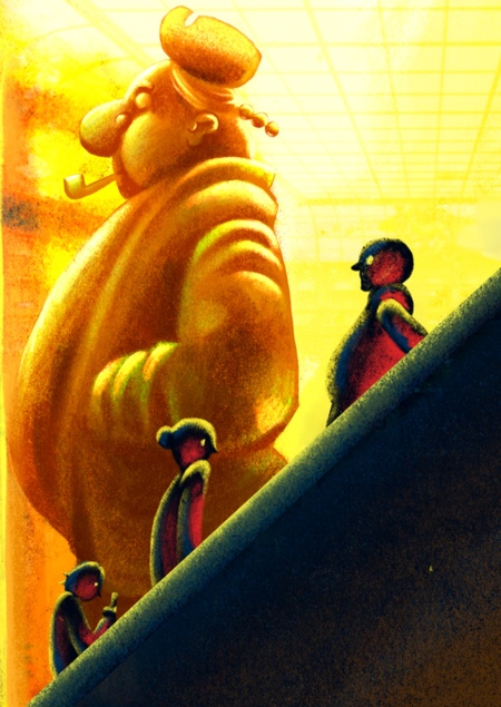 Немного о сюжете иллюстраций: в Центральный Детский Магазин каким-то образом попадают гигантские скульптуры пиратов из мультфильма «Остров Сокровищ». Посетители поначалу игнорируют инородные изваяния, но начинают настораживаться и паниковать, как только замечают их. Испуганная толпа охвачена ужасом, когда фигуры начинают оживать.