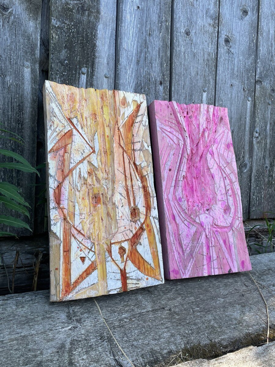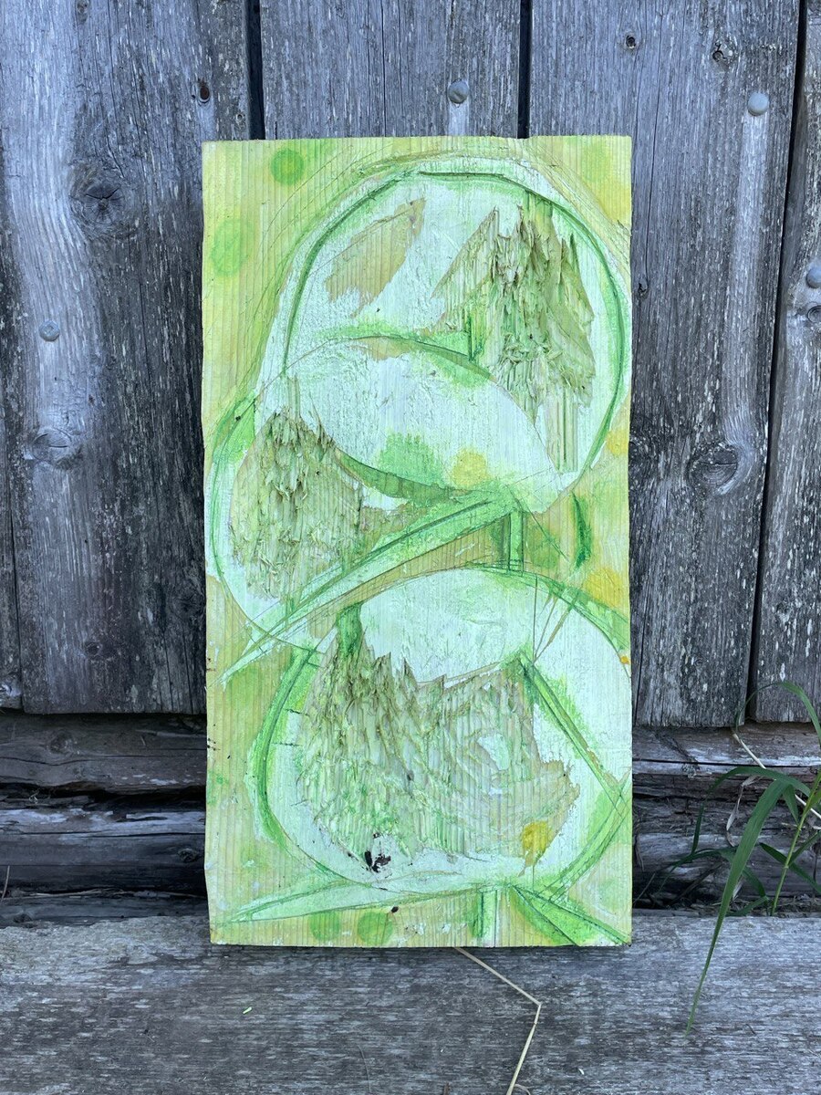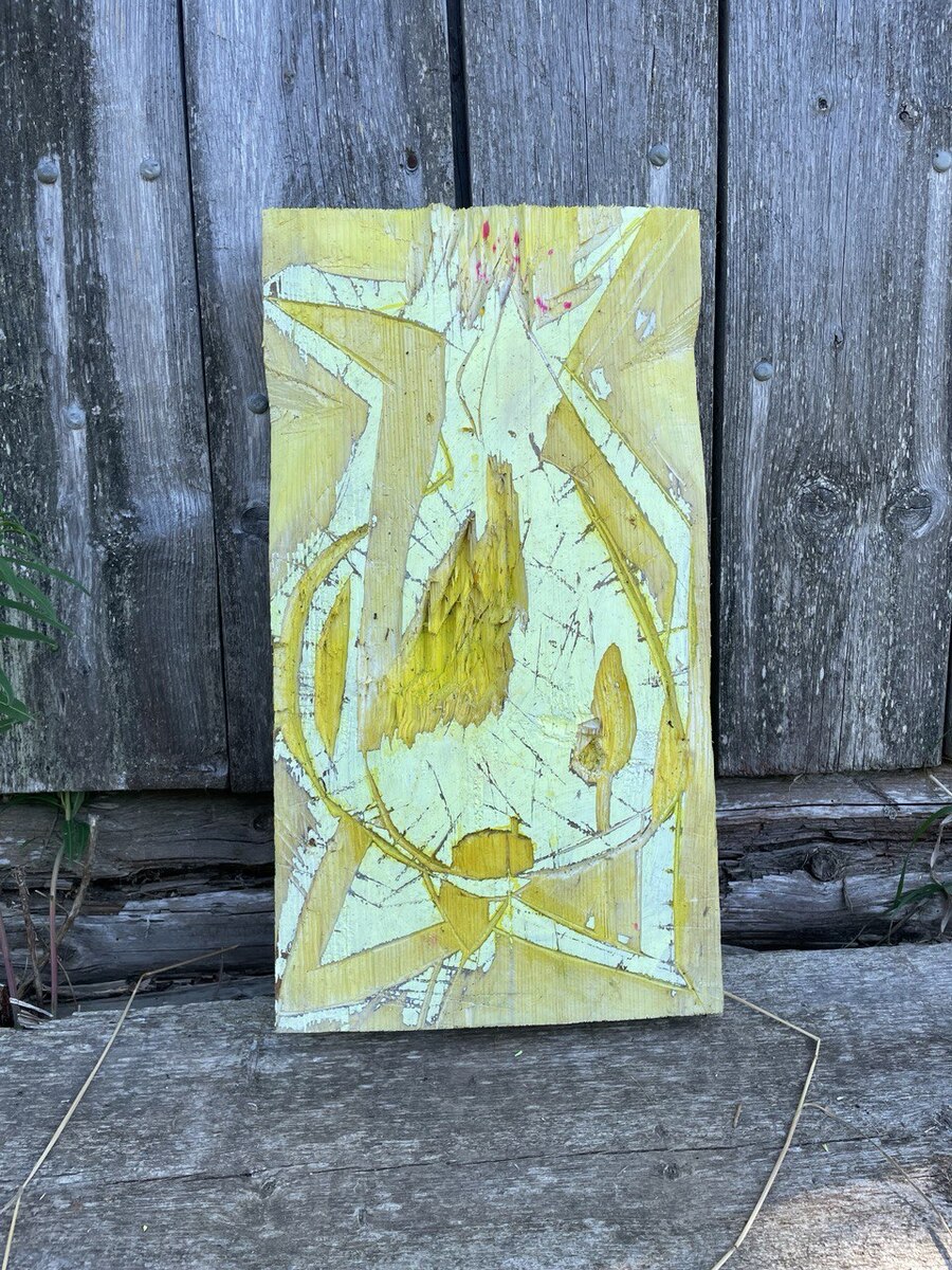 Придуманные авторские объекты отвечают актуальной повестке, связанной с устойчивым развитием. В процессе создания серии панно произошла «транспортировка» потолка старой бани в искусство. Толстые доски, из которых выполнена серия были вырезаны из потолка обветшалой бани, которая находилась на берегу реки в деревне, скрытой в глуши непроходимых Тверских лесов неподалеку от Торжка.