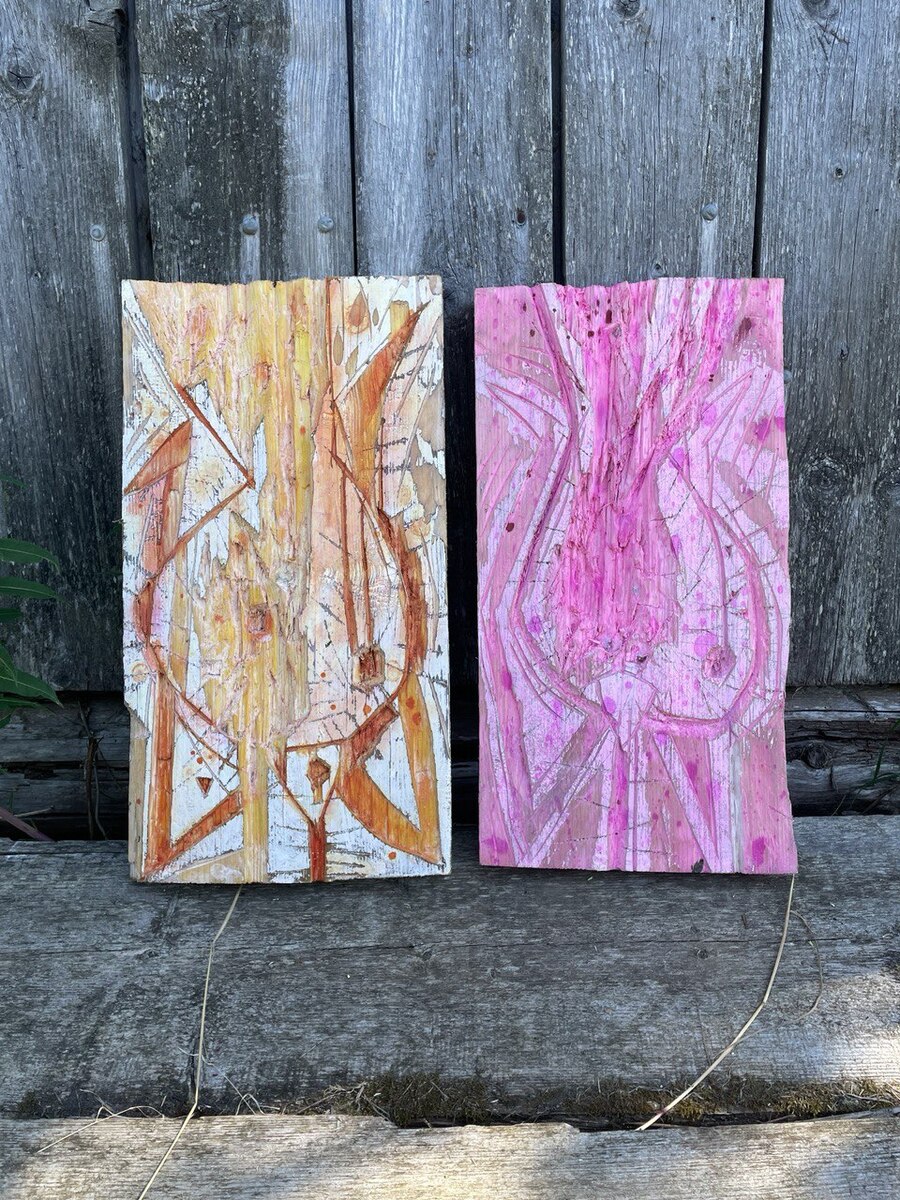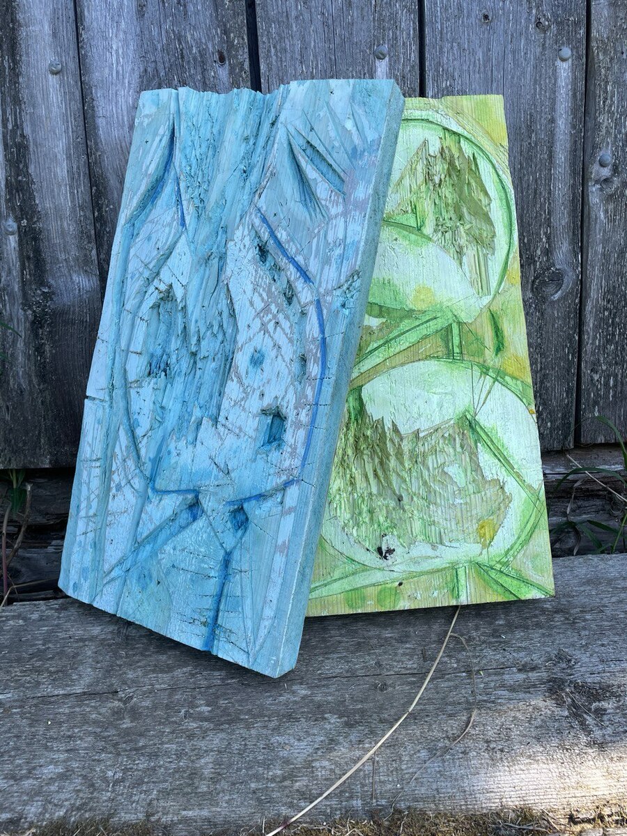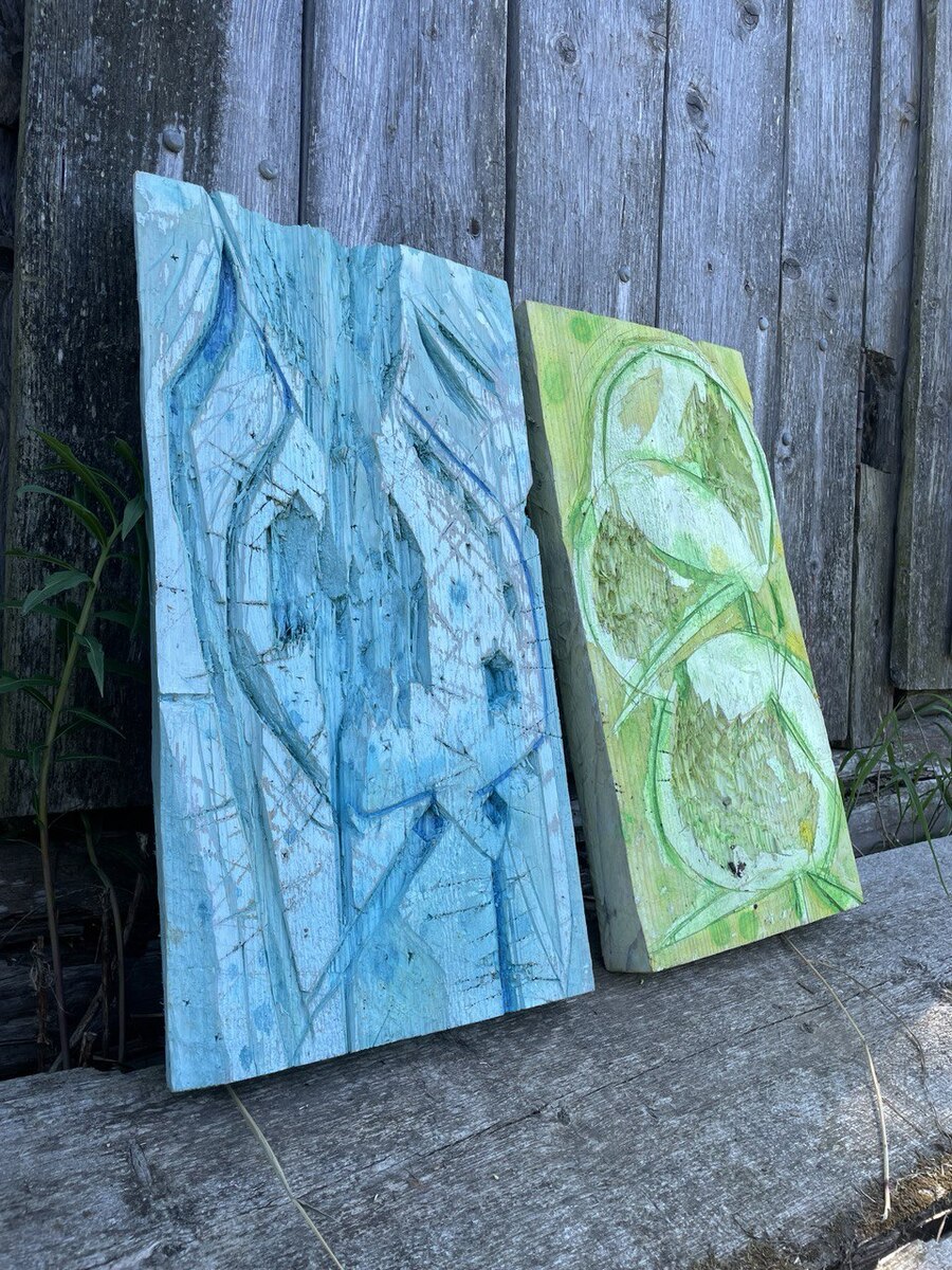 Придуманные авторские объекты отвечают актуальной повестке, связанной с устойчивым развитием. В процессе создания серии панно произошла «транспортировка» потолка старой бани в искусство. Толстые доски, из которых выполнена серия были вырезаны из потолка обветшалой бани, которая находилась на берегу реки в деревне, скрытой в глуши непроходимых Тверских лесов неподалеку от Торжка.