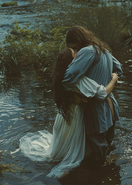 Диана повернулась к реке и увидела как из нее поднимается столб глины. Белая смесь постепенно приобретала человеческий вид. Что-то необъяснимое медленно выходило из реки и направлялось к сестрам. Чем ближе силуэт подходил, тем отчетливее Диана видела острые скулы, сильные руки и темные вьющиеся волосы. Силуэт был одет в тонкое и вьющееся морского оттенка облачение. Подойдя вплотную девушка разглядела необычайной красоты молодого юношу. Он склонился над телом Анны и одни движением поднял ее на руки. Девушка проваливалась в сон, кровь придала ее рубашке алый цвет и тоненькой струйкой текла по телу. Диана схватила сестру за руку.
